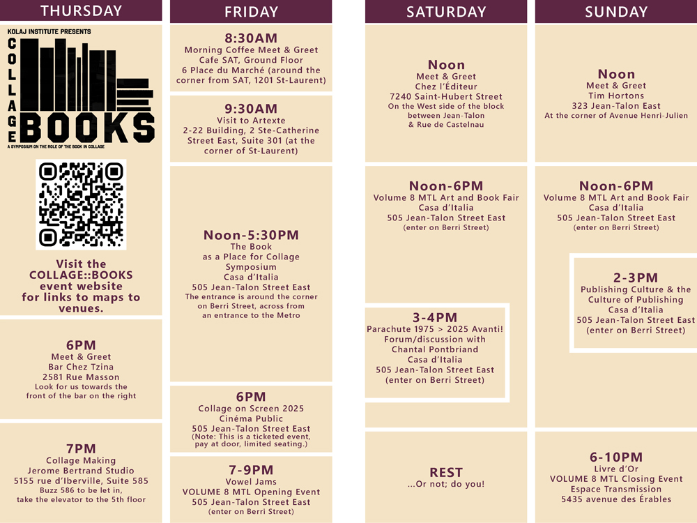 Join Kolaj Institute in Montreal, 2-5 October 2025, for COLLAGE::BOOKS, a multi-day event about collage, community, and publishing. The center of the event is a symposium on the book as a place for collage that will take place on 3 October 2025 in Montreal. Participants in COLLAGE::BOOKS will also enjoy networking events, collage making sessions, and site visits.