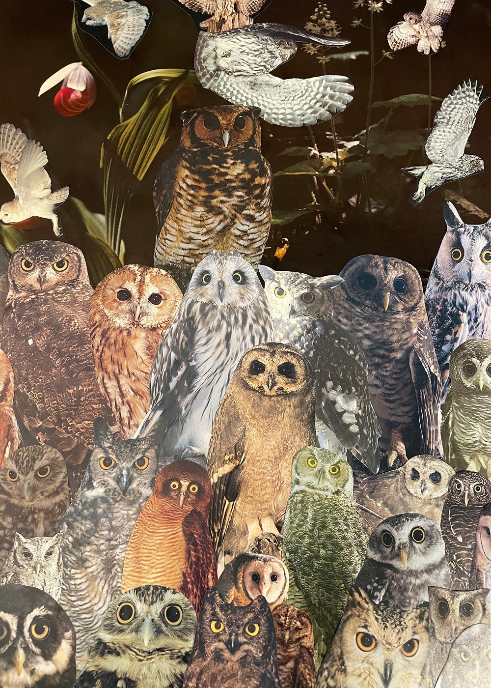 Image: Parliament of Owls by Clare Jones (14″x10″ collage print on 140lb Canson cold press watercolor paper; 2023)