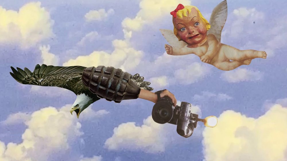 Image: Still from Angel Baby vs. Drone Eagle by Emily Denlinger (short collage film, 51 seconds, 2024)
