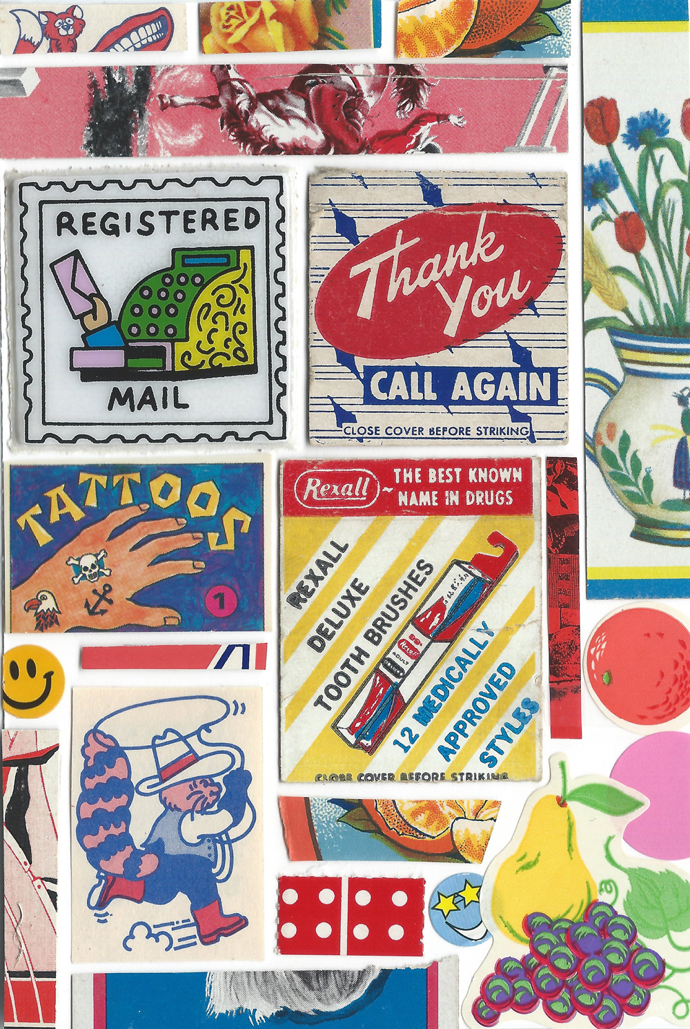 6″x4″; vintage ephemera (magazine & book clippings, stickers, matchbooks, and toy pieces) on paper; 2023. Courtesy of the artist.