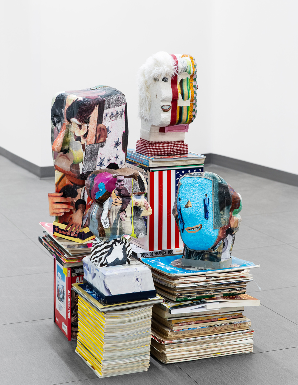 approx. 48″x36″x24″; paper collage sculptural constructions, and magazines, books, publications as pedestal mounds; 2025. Courtesy of the artist.