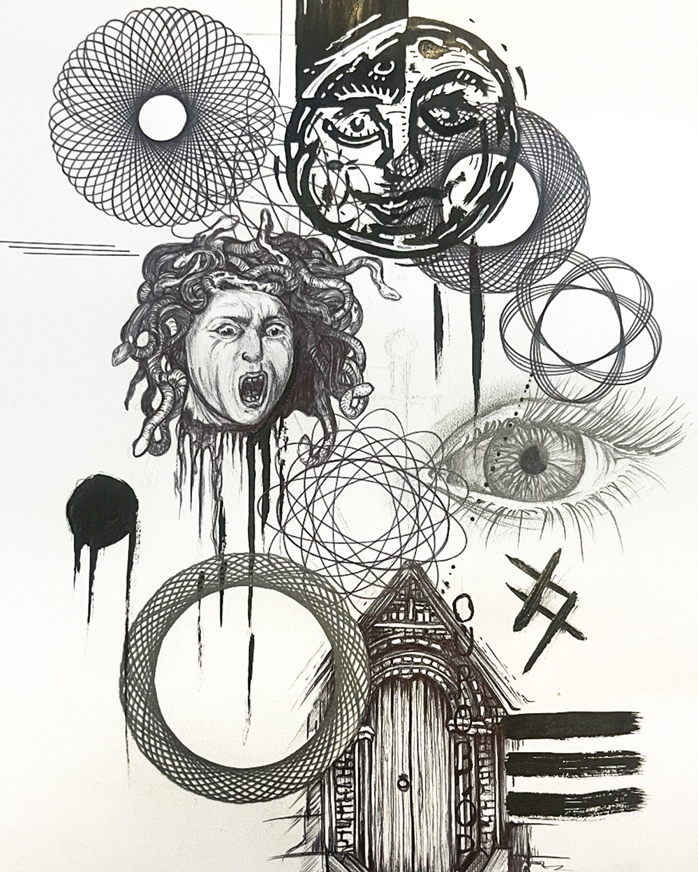 appox. 12″x12″; ink illustration, digital print on archival paper, photographed with found objects; 2023. Courtesy of the artist.