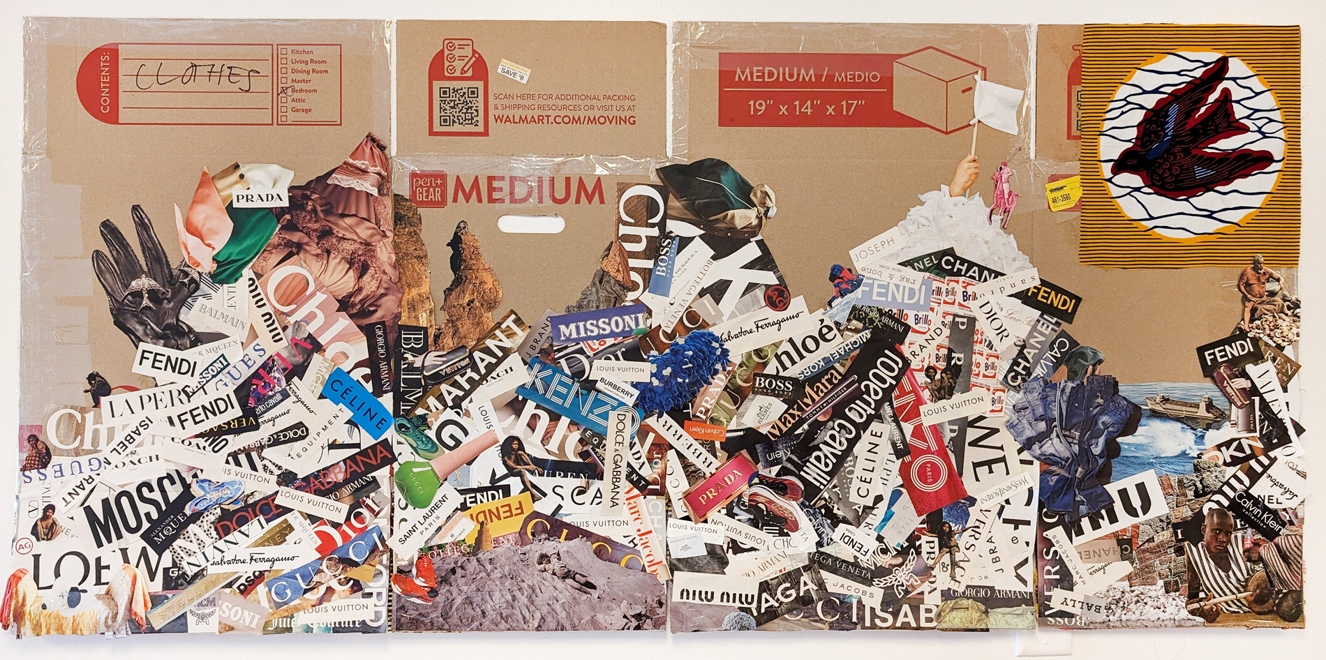 Label Hoe is a collage of high-end fashion labels on a Walmart moving box by Detroit, Michigan artist Jonilyn Paige, who comes at this subject from a unique perspective having worked in the luxury retail industry and as a coordinator of mall operations where she observed consumerism and waste first hand. She also traveled to Windhoek, Namibia with the African Democracy Project to research Herero fashion. With this artwork, Paige speaks to issues of sustainability and consumerism and raises concern about the impact of fast fashion waste
