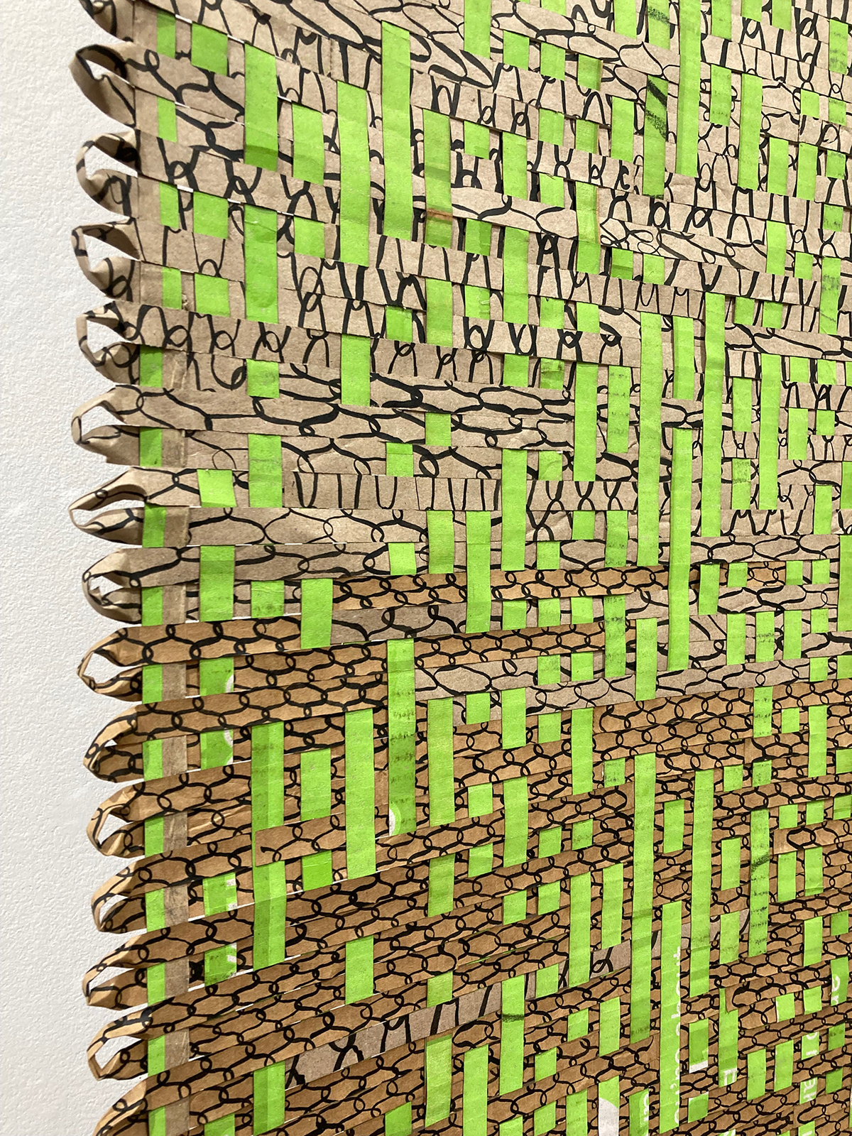 In October 2025, Kolaj Institute opened an inquiry into Trash as Material. We brought together six artists in New Orleans to visit The Green Project and learn about how they process unwanted building materials and waste paint. They heard from New Orleans artist Jill Stoll about her “Lost Women” series and how she makes large woven artworks using post-consumer cardboard waste. The artists made artwork that is part of the exhibition, “Trash as Material” at Kolaj Institute Gallery 25 October to 29 November 2025. A Virtual Artist Residency will take place in November & December 2025 with an eye towards a second exhibition in 2026 and a book in 2027. Trash as Material builds on Kolaj Institute’s Politics in Collage Project.