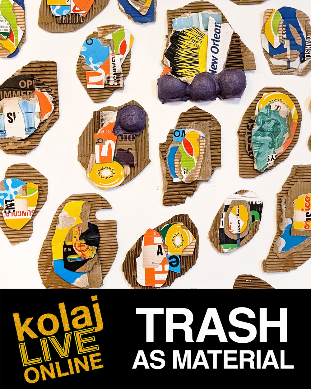 During the “Collage the Planet: Trash as Material Artist Residency,” six artists came to New Orleans and developed a practice of using trash as materials and made artwork for Kolaj Institute Gallery exhibition, “Trash as Material“, 25 October-29 November 2025. They created work that explored environmentalism in art and made artwork that contributes to a broader dialogue on sustainability and ecological consciousness. They reflected on the balance between human activity and the environment and explored strategies to draw attention to issues such as climate change, biodiversity loss, and the impact of industrialization on our planet. This residency was particularly important to New Orleans, a city deeply connected to its natural surroundings and witness to ecological challenges and natural disasters that have left indelible marks on its landscape and community. Guest speakers included New Orleans collagist Jill Stoll and Erin Genrich, Environmental Education Coordinator at The Green Project.