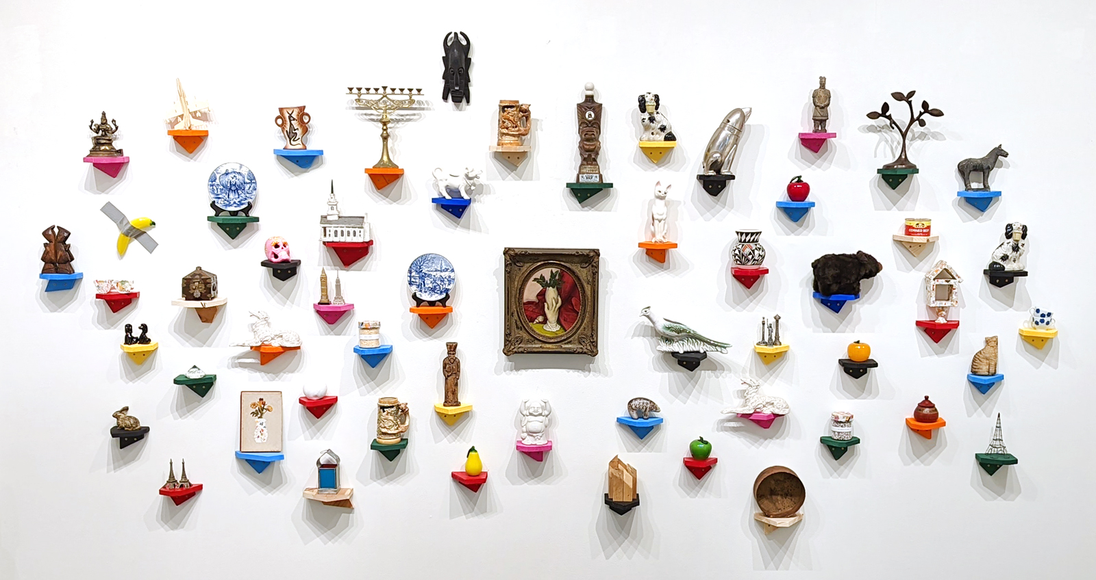 Inspired by Michael Thompson’s Rubbish Theory: The Creation and Destruction of Value, where the author traces the life cycle of Trash and the role museums play in defining and shaping cultural artifacts, Kadour presents a wall of objects as a comment on the role material culture plays in shaping history. The installation combines history museum objects, artworks, and found objects and invites the view to consider the significance or insignificance of each object.